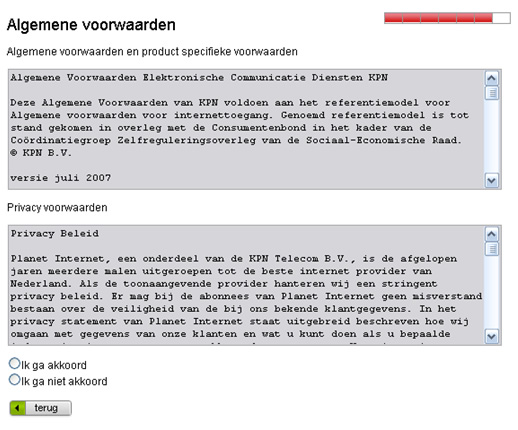 - Ten eerste dienen de algemene voorwaarden voor de wederpartij toegankelijk te zijn. Dat kan bijvoorbeeld door gebruik te maken van een hyperlink naar de algemene voorwaarden. Een scrollbar, zoals XS4ALL en Planet Internet hebben opgenomen (zie casus), is niet per sé noodzakelijk. Aangezien veel internetgebruikers popup-blockers hanteren, zijn algemene voorwaarden mijns inziens ontoegankelijk indien er gebruik wordt gemaakt van een popup-venster.