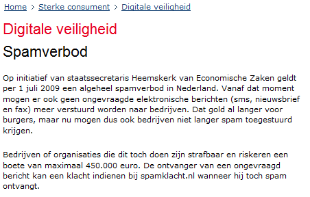 Op de website van het Ministerie van Economische Zaken staat nog steeds (foutief) dat het volledige spamverbod op 1 juli 2009 in gaat en ook tijdens de behandeling heeft staatssecretaris Heemskerk toegezegd dat het spamverbod uiterlijk 1 juli 2009 in zou gaan.