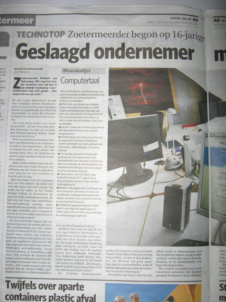 Gisteren stond er in de Haagse editie van het Algemeen Dagblad twee pagina groot interview met Robbert Hulsentop van Technotop Internetdiensten. Robbert is één van de jonge ondernemers in onze branche die ondanks zijn jonge leeftijd een leuk en vooral ook solide bedrijf heeft weten neer te zetten.