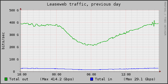 De capaciteit van 750 Gbps in het netwerk is twee keer zo groot als de daadwerkelijke hoeveelheid bandbreedte die door klanten wordt verbruikt. Het daadwerkelijke internetverkeer bedraagt momenteel ongeveer 400 Gbps. Op de noc pagina valt actueel in een grafiek af te lezen hoe het dagelijkse internetverkeer in het netwerk van LeaseWeb zich ontwikkelt.
