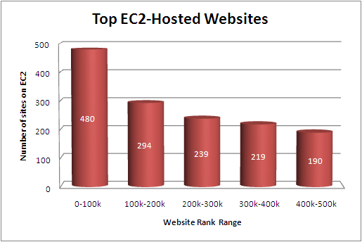 Amazon’s EC2 (Cloud Computing) platform wordt telkensĀ meer gebruikt voor hosting van grote websites. Uit onderzoek van InfiBase blijkt dat 1.422 (0.28%) van de 500 duizend grootste websites worden gehost op Amazon EC2. Naar mate de website groter is, neemt ook de kans toe dat deze daar gehost wordt toe. Van de grootste 25 duizend websites worden er zelfs 168 (0.67%) gehost op Amazon EC2.