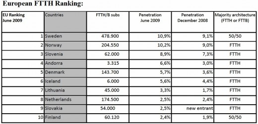 Nederland neemt met 175.000 aansluitingen de 8e plek in de top 10 in, met een penetratie van 2,5% in juni van dit jaar. December vorig jaar was dit nog 2,4%. Een kleine groei dus. Koploper is Zweden, dat een penetratie kent van 10,9%. Een half jaar terug was dit nog 9,1%. Hierbij moet wel opgemerkt worden dat de Zweedse cijfers een combinatie zijn van zakelijke (Fiber to the business) en particuliere ftth-aansluitingen.