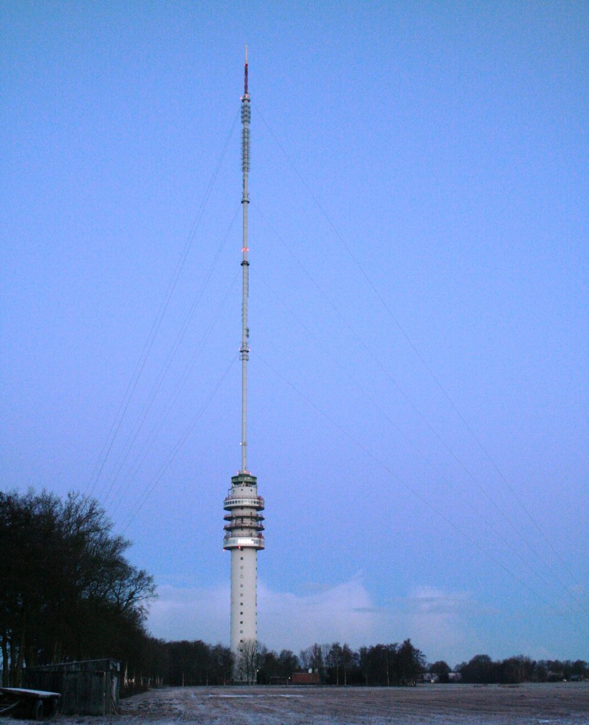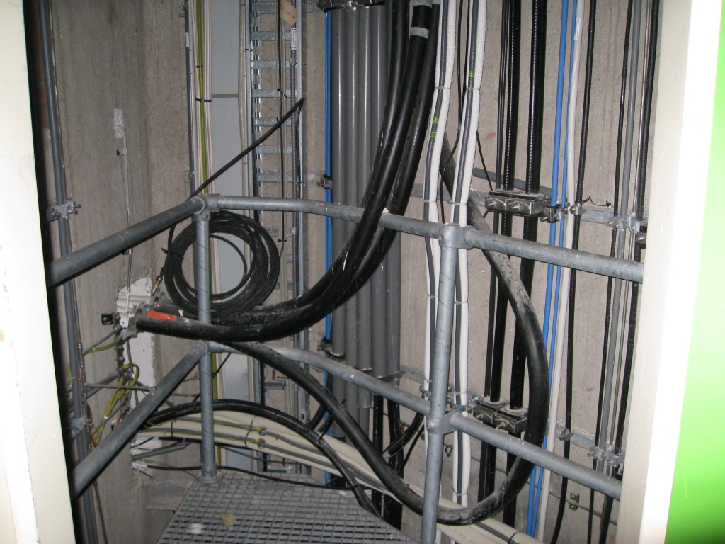 Wanneer je aan de voet van de toren staat zie je een grote ronde betonnen paal van zo’n 10 meter doorsnee die meer dan 100 meter de lucht in gaat. Daarnaast vroeg ik me af of er een lift zou zijn in het gebouw. Om die vraag meteen te beantwoorden: ja. Eenmaal binnen in de Haarlemse toren kom je in een rechthoekige hal terecht. Aan de rechterkant zit een toilet en een kantoor en aan de linker kant bevinden zich de kabelschat, het trappenhuis en de lift.