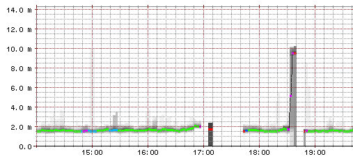 Precies op de momenten dat het netwerk van Eweka plat ging, is ook in de AMS-IX statistieken een duidelijk dip te zien van de hoeveelheid dataverkeer. Zie onderstaande smokeping grafiek van de downtime van het Eweka netwerk en het AMS-IX dataverkeer.