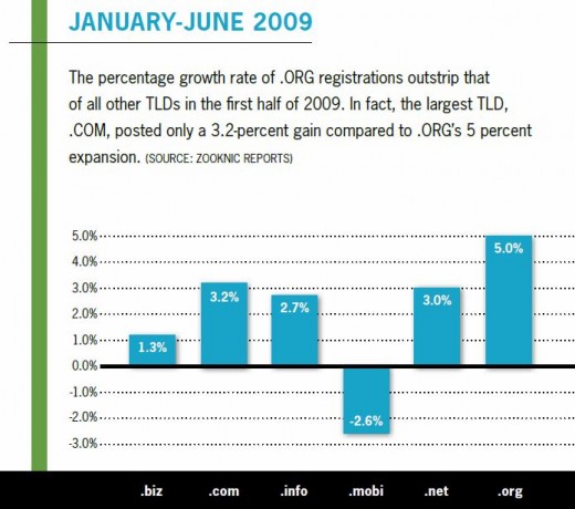Zo valt te lezen dat het gebruik van het .org-domein met 11% gegroeid is naar meer bijna 7,7 miljoen domeinnamen in het eerste half jaar van 2009. Dit is opvallend, omdat bij andere extenties zoals .com en .net juist een (kleine) daling te zien is. De economische recessie zou hiervan de oorzaak zijn, zo berichte ISPam.nl eerder. De effectieve groei van het .org-domein zit op ca. 5% als we de vervallen domeinen meetellen en deze afzetten tegen andere TLD’s.