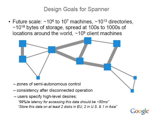 Uiteindelijk is het de bedoeling om Spanner op te schalen tot tussen de één en tien miljoen servers, die verspreid staan over tussen de 100 en 1.000 locaties wereldwijd. Deze systemen zullen uiteindelijk één biljoen directories bevatten met één exabyte aan opslag. Verder stelt Dean dat Google werkt met “zones of semi-autonomous control”, waaruit blijkt dat Google haar infrastructuur verdeeld in autonome onderdelen die onafhankelijk van elkaar functioneren.