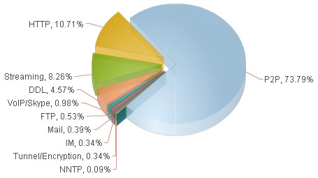 P2P domineert het internet, gemiddeld wordt 75 procent van het internet dataverkeer gebruikt voor P2P toepassingen. In de nachtelijke uren loopt dit percentage zelfs op tot 95 procent, zo stelt een onderzoek van Ipoque. Ook Direct Download Links (DDL), waarbij internetters met één klik bestanden kunnen downloaden van websites als Rapidshare.com, nemen 5,7 procent van het dataverkeer voor hun rekening.