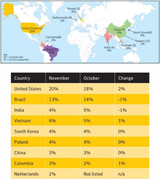 Nederland is weer ergens goed in. Echter deze keer is het geen topvermelding om trots op te zijn, met een 9e plek in de toplijst van landen waarvandaan spam verzonden wordt. Dat blijkt uit de nieuwste cijfers in de decembereditie van ‘State of spam’ van Symantec. Maarliefst 2% van de wereldwijde spam wordt vanaf Nederlandse bodem verzonden.