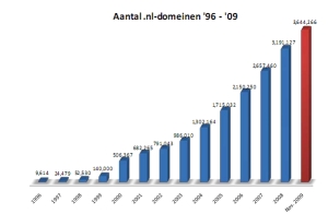 Vorig jaar kwamen er gemiddeld per dag 1334 .nl-domeinen bij, zo blijkt uit cijfers van de SIDN. In 2009 groeide het aantal .nl-domeinnamen met 15,3 procent tot 3.678.224 eind december. Dat komt neer op ongeveer één registratie op gemiddeld elke 4,5 inwoners in Nederland.
