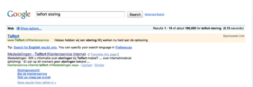 De klantenservice was door de storing ook niet bereikbaar. Opmerkelijk is dat Telfort Adwords inzette bij Google om richting klanten te communiceren. Naast Adwords werd Twitter ook ingezet, waarbij eerst gecomminiceerd werd dat het om een DHCP en/of DNS probleem zou gaan.