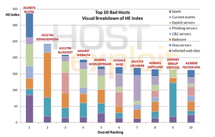 Met een HE-index van 337,3 en een AS-score van 29.073 staat Ecatel garant voor bullet proof hosting, spam, server exploits en geïnfecteerde websites, zo stelt HostExploit in het onderzoek. Tweede en derde in de lijst zijn respectievelijk DemandMedia en BlueHost uit de Verenigde Staten.