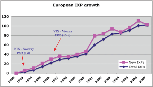 Christian Panigl van Euro-IX, de vereniging van internet exchanges, ging in zijn presentatie langs een aantal statistieken over exchanges. Gezien deze presentatie vooral over statistieken ging heb ik er twee grafieken uitgehaald, want dat zegt veel meer dan woorden.