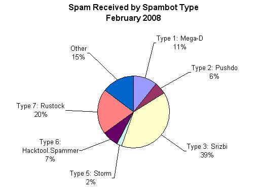 In februari 2008 waren er drie botnets verantwoordelijk voor 70 procent van alle verzonden spam, zo blijkt uit onderzoek van Marshal. De belangrijkste bron van spam is het Srizbi botnet dat maar liefst 39 procent van alle spam heeft verstuurd. Op gepaste afstand volgt het Rustock botnet dat 20 procent een ‘goede’ tweede is en Mega-D botnet neemt met 11 procent de derde plaats in.
