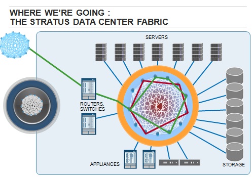 In Project Stratus worden servers gekoppeld met opslag en netwerkdiensten en wordt het netwerk van datacenter op die manier teruggebracht van drie naar twee lagen en uiteindelijk naar één laag.
