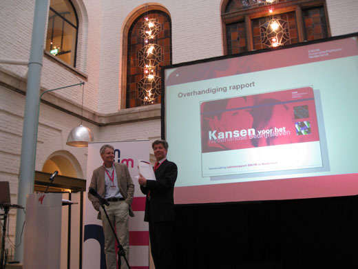Overhandiging van het eindrapport van het ENUM InnovatiePlatform Nederland door voorzitter Rob Meijer aan ENUM.NL directeur Roelof Meijer.