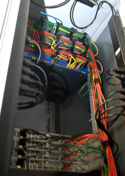 Alle racks op de datavloer krijgen zowel hun stroom als netwerk connectiviteit van boven, onder de datavloer bevindt zich daardoor zuiver de luchtstroom. In elke rij van racks wordt het eerste rack als patchkast gebruikt, waarvandaan de netwerk connectiviteit naar alle andere racks in de rij wordt geregeld. Elke rack heeft uplinks naar twee core switches.