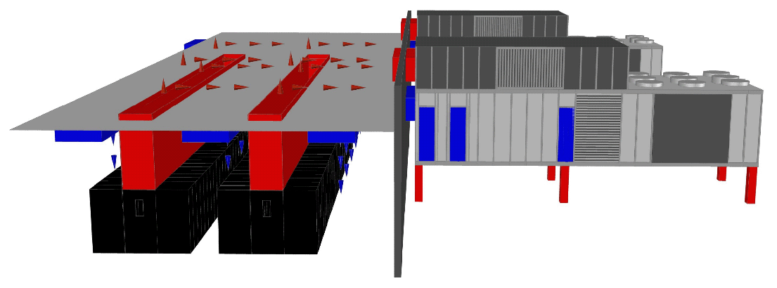 Daar heeft Rob Roy van Switch natuurlijk wel een punt. Is het in plaats van het cold corridor principe, niet veel logischer om stijgende warme lucht af te voeren via het plafond en dalende koude lucht vanaf het plafond de datavloer op te blazen, zoals op onderstaande afbeelding?