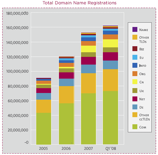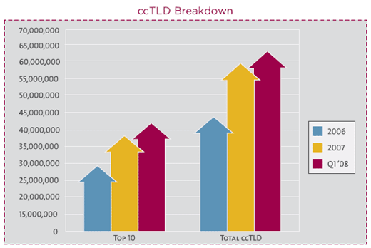 De groei van landen domeinnamen, zogenaamde country code Top Level Domains (ccTLD’s) is niet te stuiten. In het eerste kwartaal van 2008 waren er maar liefst 63 miljoen ccTLD’s geregistreerd tegenover een totaal van 162 miljoen geregistreerde domeinnamen. De groei van de ccTLD’s is voornamelijk te wijten aan enkele registries met een groei van meer dan 10 procent, dit zijn .cn (China), .fr (Frankrijk), .es (Spanje), .pl (Polen) en .ru (Rusland) volgens de Domain Name Industry Brief van VeriSign.