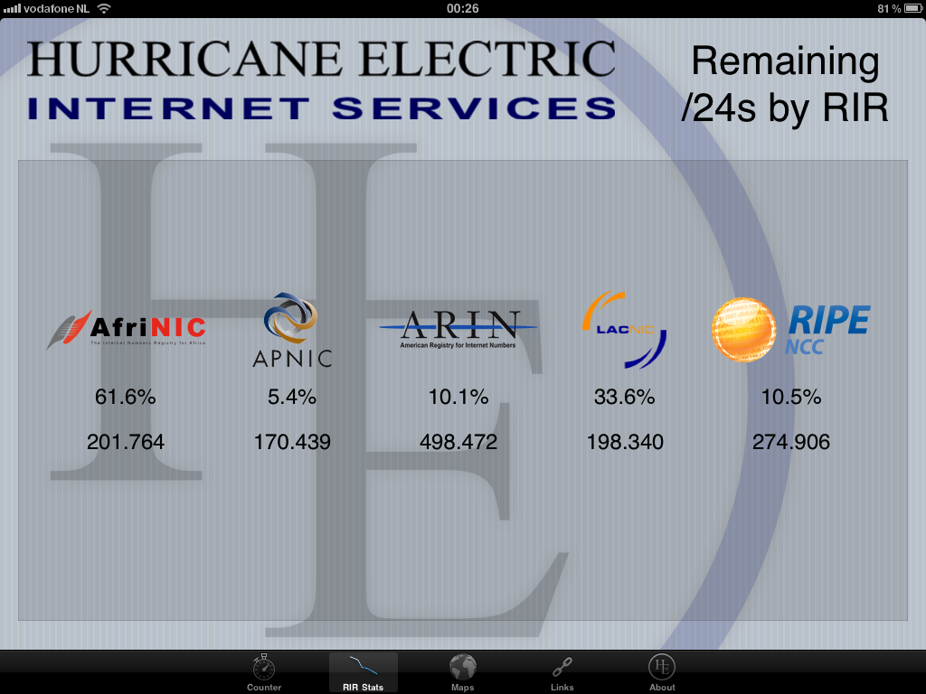 Wie denkt dat het probleem vooralsnog enkel in Azië speelt heeft het daarbij mis. ARIN (Verenigde Staten) en RIPE (Europa en Rusland) beginnen aardig door de voorraad adressen heen te gaan, zo laat onderstaand schema van afgelopen nacht zien.