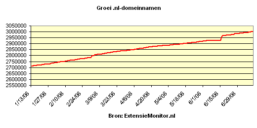 Vandaag gaat het gebeuren, de 3.000.000ste .nl-domeinnaam wordt geregistreerd. De vraag is enkel nog welke .nl-domeinnaam gaat worden vastgelegd door welke tussenpersonen en in opdracht van welke registrant? Op het moment van schrijven zitten we volgens de (semi-)live registratie statistieken van SIDN nog 762 .nl-domeinnamen af van nummer 3.000.000. Dus het kan elk moment zover zijn!