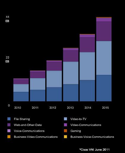 Het wereldwijde internetverkeer zal in 2015 oplopen tot bijna een ‘zettabyte’ (1 miljard terabyte) – vier maal zo veel als in 2010. De explosieve toename van het verkeer is vooral te verklaren door de toename van video op internet (zie onderstaande grafiek).