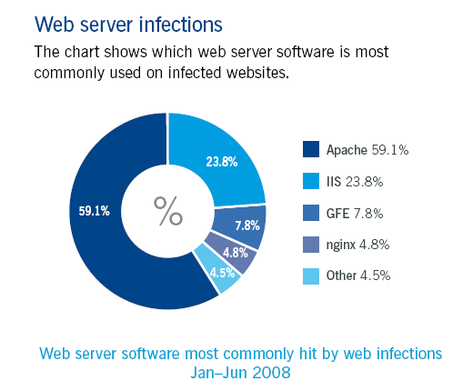 Bijna 60 procent van de webbased bedreiging in januari tot juni 2008 betroffen Apache servers. Dit is een opmerkelijke toename in vergelijking met het niveau van 2007, toen Apache webservers goed waren voor minder dan 49 procent van de webbased bedreigingen. Een groot aantal Apache servers worden gehost op Linux of een UNIX variant, wat laat zien dat malware niet zuiver een Microsoft probleem is.