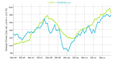De IDNX, oftewel de prijsindex voor internetdomeinnamen, is een nieuwe index die de prijsontwikkeling van domeinnamen gedurende de afgelopen zes jaar weergeeft. Volgens Sedo vertoont de IDNX opvallende overeenkomsten met het koersverloop van de NASDAQ, de Amerikaanse beursvloer waar veel techbedrijven een notering hebben. Zo laat de IDNX een soortgelijke trend zien als de koers van het aandeel Google, aldus Sedo.