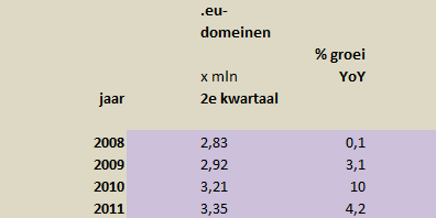 Toch is het aantal .eu-domeinen met 4,2 procent gestegen in vergelijking met dezelfde periode vorig jaar. Aan het einde van het tweede kwartaal waren 3,35 miljoen .eu-adressen geregistreerd, tegen 3,21 miljoen dezelfde periode van 2010 (zie grafiek). Dat staat in het kwartaalverslag van de .eu-registry Eurid.