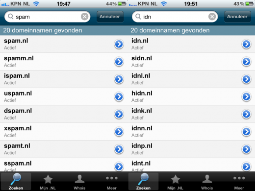 Een opvallende functie van de app is dat op basis van een woord kan worden gezocht naar reeds geregistreerde domeinnamen. De app geeft binnen enkele seconden 20 geregistreerde .nl-domeinnamen weer. De app lijkt de lijst met domeinnamen rechtstreeks uit de database van de SIDN te halen. Daarmee is de functionaliteit van de app een toepassing die niet door een registrar of andere derde partij kan worden ontwikkeld op basis van de whois.