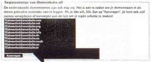 Via de website van Domeinbalie.nl had de klant twee domeinnamen geregistreerd. Op de pagina waar de registraties bevestigd werden verscheen er een tekstveld in beeld met een suggestie om zeven andere variaties op de domeinnamen te registeren met daaronder een knop “Aanvragen”, zonder dat de prijzen of beschikbaarheid van de bewuste domeinnamen werden vermeld. Nadat de klant op de knop had gedrukt werden de domeinnamen direct geregistreerd.