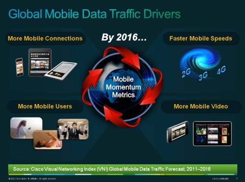 Tussen nu en 2016 zal het mobiele dataverkeer wereldwijd groeien tot ongeveer 10,8 exabytes per maand. Per jaar wordt er dan 130 exabytes (circa 33 miljard dvd’s met data) verstookt, denkt Cisco. Dat is gemiddeld 18 keer zoveel als er in 2011 aan mobiel dataverkeer werd gemeten.