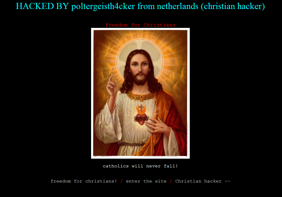 Op enkele sites plaatste de hacker een afbeelding van Jezus met begeleidende teksten als ‘Vrijheid voor Christenen’ en ondertekend door ‘Poltergeisth4cker from netherlands’.