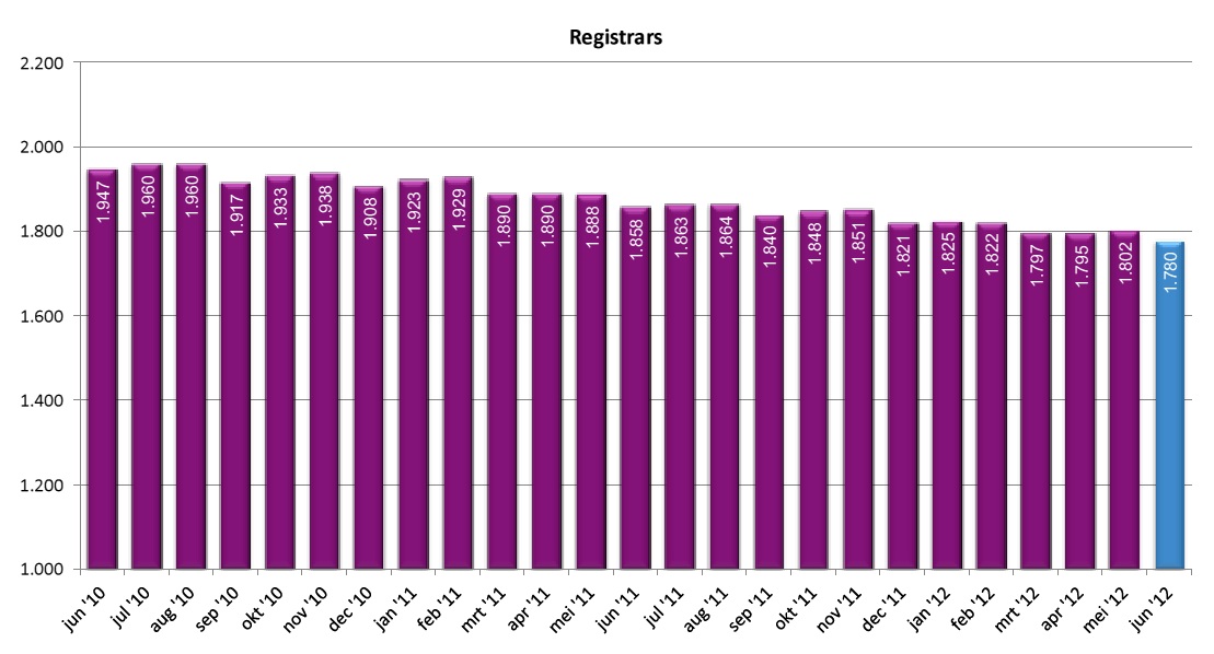 In de maand juni van dit jaar had de SIDN 1780 aangesloten registrars (pdf). In dezelfde maand in 2010 waren dat er nog 1947. Dat is een daling van 8,6 procent gedurende de afgelopen twee jaar. Volgens Michiel Henneke, marketing manager bij de SIDN, is er al enkele jaren sprake van een dalende trend (zie grafiek onderaan).