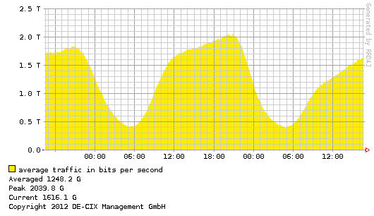 De DE-CIX in Frankfurt heeft vorige week een nieuw record gezet voor datasnelheid. De internetexchange bereikte een snelheid van 2 terabit per seconde. De grens werd vorige week voor het eerst bereikt, maar ook gisteren schoot de snelheid over de 2Tb/s.