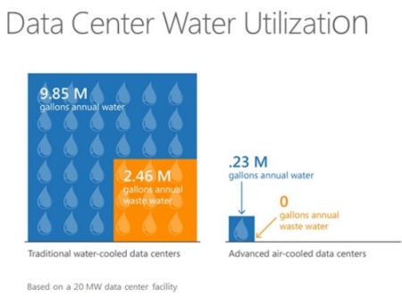 Bij een normaal 20 MW datacenter is ongeveer een kwart van al het benodigde water uiteindelijk afvalwater. Ouderwetse datacenters die met airconditioning units worden gekoeld kunnen jaarlijks ongeveer 45 miljoen liter water verbruiken waarvan ruim 11 miljoen liter water als afvalwater naar buiten gaat. Bij de vier luchtgekoelde datacenters van Microsoft zou jaarlijks iets minder dan één miljoen liter water nodig zijn. En bovendien wordt er geen afvalwater geproduceerd omdat het enige water dat verdwijnt, verdampt.