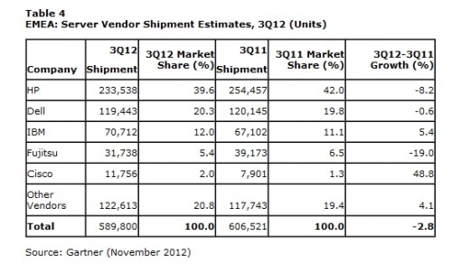 Vier van de vijf grote serverfabrikanten (HP, IBM, Cisco en Fujitsu) zagen de omzet van serververkopen in het derde kwartaal dalen. Alleen Dell was hierop een uitzondering. Dit bedrijf had wereldwijd voor ongeveer 3,5 miljard dollar aan servers verkocht en heeft daarmee een marktaandeel van ruim een kwart (27,6%).