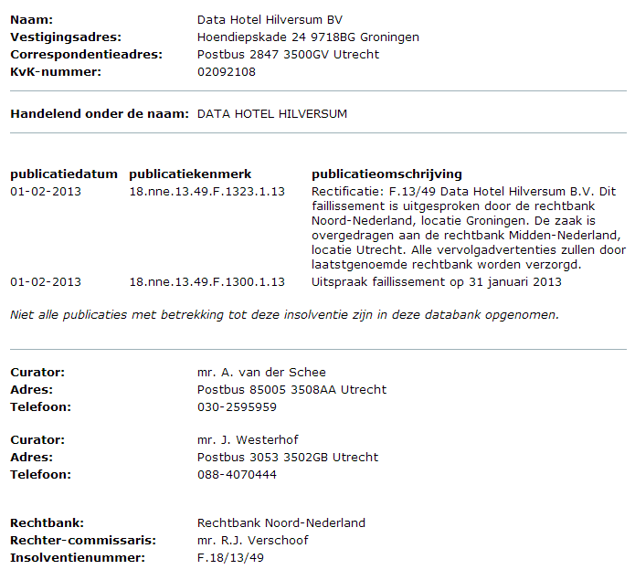 Ondanks eerdere geruststellende woorden van TCN Data Hotels directeur Saskia Bohemen is één van de datacenters van TCN toch failliet gegaan. Op 31 januari werd Data Hotel Hilversum dat gevestigd is op het Media Park door de rechtbank Noord-Nederland (Groningen) in staat van faillissement verklaard, zo blijkt uit het Centraal Insolventieregister.