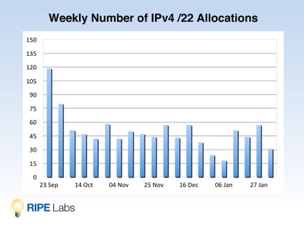 Volgens het beleid van RIPE kan elke LIR één /22-blok krijgen uit deze laatste /8-pool. Nieuwe aanbieders voor alleen IPv4 worden niet meer toegelaten. In de eerste week van februari werd een belangrijke mijlpaal gehaald door het uitdelen van de duizendste /22-blok, vijf maanden na de bekendmaking dat de laatste adressen nu werden gealloceerd. Nederland is daarbij nog steeds een van de grootverbruikers, samen met Engeland, Frankrijk, Rusland en Duitsland.