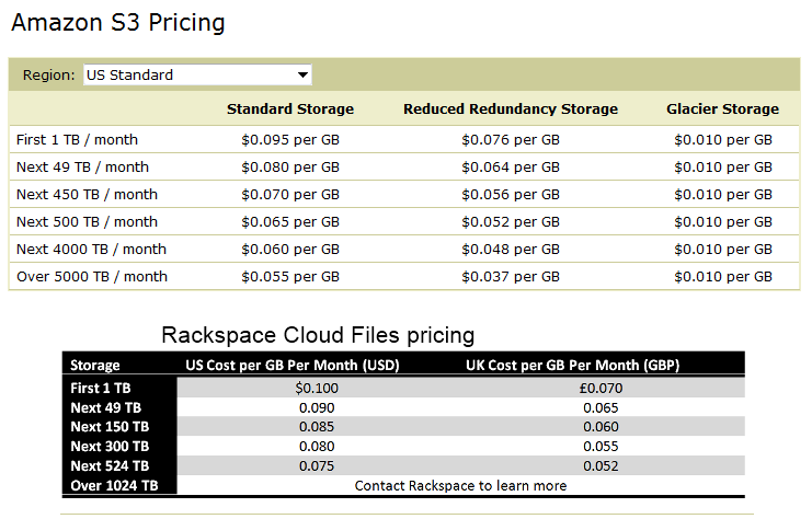 Met deze gedifferentieerde prijzen lijkt Rackspace de concurrentie met branchegenoot Amazon Web Services te willen verhevigen, waar het gaat om Public Cloud-diensten. Hoewel Rackspace nog altijd iets duurder is dan Amazon Web Services want daar betalen klanten voor de eerste GB 0,095 dollar. Ook met de opslag van grotere hoeveelheden aan data zit Rackspace tussen 0,10 tot 0,20 dollar per GB/mnd boven Amazon (zie tabel).