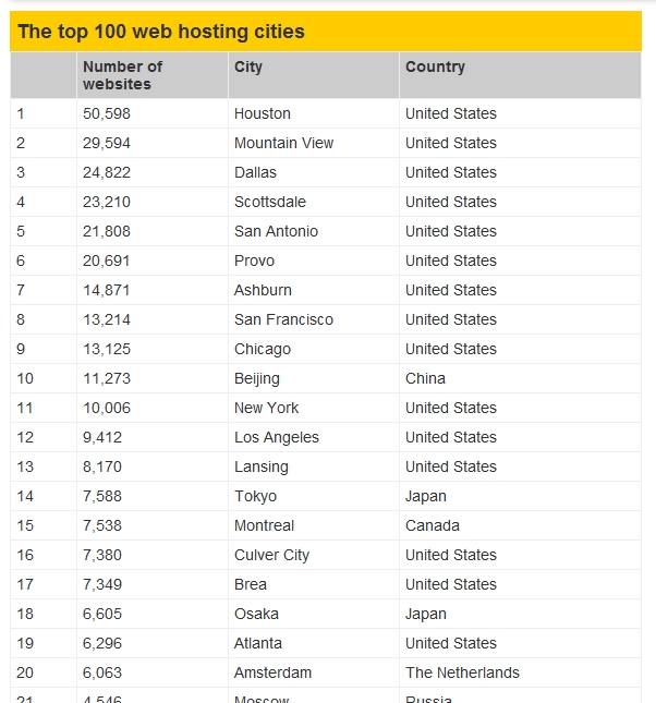 De meeste grote websites worden Houston, in de Amerikaanse staat Texas, zo blijkt uit een ranglijst van Royal Pingdom. Houston wordt gevolgd door Mountain View en Dallas.