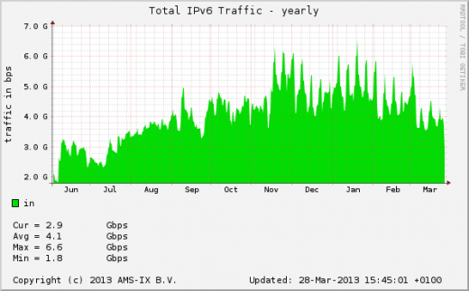 World-IPv6-LaunchOndanks diverse campagnes om over te schakelen van IPv4 naar IPv6, neemt de hoeveelheid verkeer over het nieuwe protocol niet toe. Integendeel: de statistieken van de AMS-IX laten opmerkelijk genoeg juist een daling zien in het totale IPv6-verkeer.