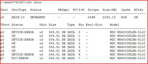John Timmer van SystemDeveloper.nl plaatste de volgende screenshot van een RAID-set waarvan verschillende harddisks defect zijn geraakt. Toevallig in een ander datacentrum op dezelfde dag zo laat Timmer in een reactie aan  ISPam.nl weten, maar het beeld is hetzelfde als wat veel servereigenaren in GYRO Center DC-1 te zien kregen.