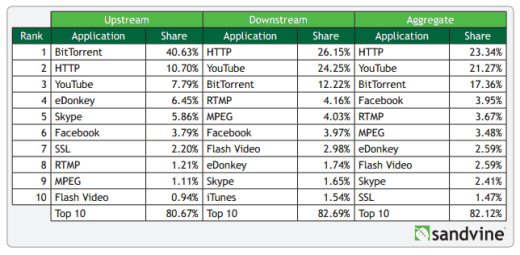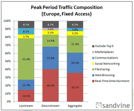 Wanneer wordt gekeken naar de hoeveelheid upstream dataverkeer in Europa, dan staat filesharing nog wel met ruime voorsprong op de eerste plaats. Ruim 51,4 procent van het upstream dataverkeer wordt gegenereerd met filesharing. Wanneer wordt gekeken naar de protocollen dan blijkt dat 40,6 procent van het upstream dataverkeer doot Bittorrent wordt gegenereerd.