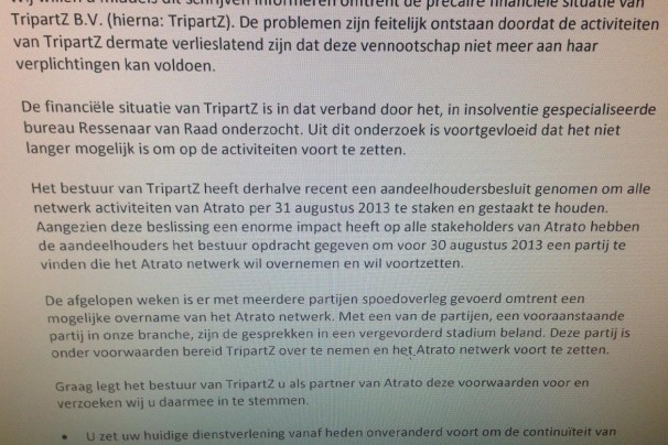 In de brief wordt uitgelegd dat de activiteiten van TripartZ verlieslatend zijn. In een aandeelhoudersbesluit is derhalve besloten om de activiteiten van Atrato per 31 augustus te stoppen, met als opdracht om voor 30 augustus een partij te vinden die deze activiteiten wil overnemen. In de brief wordt al gemeld dat er vergevorderde gesprekken zijn met ‘een vooraanstaande partij’ in de branche.