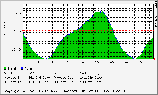Met een totaal verkeersvolume van 208gbit ging de AMS-IX gisteravond kort voor 8 uur, voor het eerst in het bestaan over de magische grens van 200gbit per seconde heen. Wat niet alleen een record is voor de AMS-IX maar ook een wereldrecord voor de hoeveelheid verkeer via een Internet Exchange.
