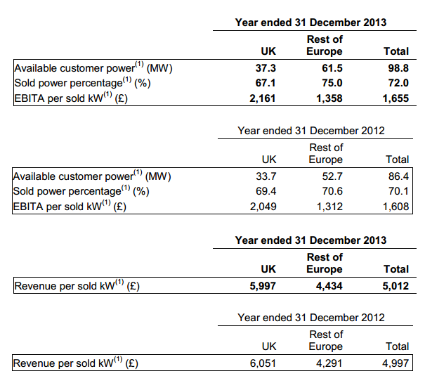 Opvallend is dat zowel de omzet als winst in Groot-Brittannië een stuk hoger is dan in de andere Europese landen waar TelecityGroup actief is. De omzet is in Groot-Brittannië £5.997 en £4.434 in de andere Europese landen. De winst per verkochte kW bedraagt in het Verenigd Koninkrijk £2.161 terwijl dat in de andere europese landen £1.358 is.