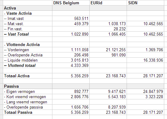 Aan materiële vaste activa hebben EURid en SIDN beide zo’n €10 miljoen op de balans staan, terwijl dat bij DNS Belgium een kleine €0,5 miljoen is. DNS Belgium heeft als enige ook immateriële vaste activa, waaronder de concessies voor nieuwe gTLD’s én ook de kosten voor onderzoek en ontwikkeling. Daarmee staat er voor een ruime €0,5 miljoen op de balans die niet tastbaar is en waarvan op dit moment ook niet te zeggen is of dit bedrag terugverdiend gaat worden of in de toekomst nog waarde zullen zijn.