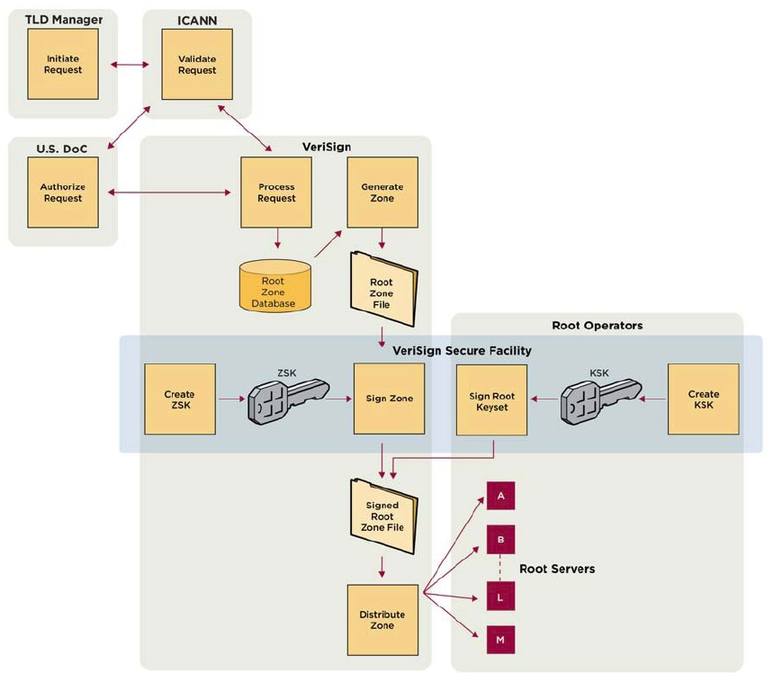 - De controle over de Key Signing Key (KSK) wordt gesplitst over verschillende organisaties, op een “M” van de “N” manier. “N” is het aantal organisaties dat een deel van de toegang tot de KSK in handen heeft en “M” is het aantal van die organisaties dat het gebruik van de KSK moet autoriseren alvorens deze gebruikt kan worden. VeriSign heeft voorgesteld om de 13 root server operators toegang tot de KSK te geven (“M”=13). Om de KSK te kunnen gebruiken zouden 5 van deze organisaties dat moeten autoriseren (“N”=5).