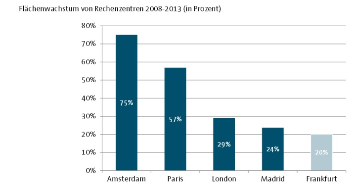 In Duitsland is de hoeveelheid datacenterruimte tussen 2008 en 2013 met ongeveer 20 procent gegroeid. Daarmee bungelt het land onderaan de top vijf. Amsterdam staat aan de top met een groei van maar liefst 75 procent, aldus BITKOM. Amsterdam wordt gevolgd door Parijs (57%), Londen (29%) en Madrid (24%).