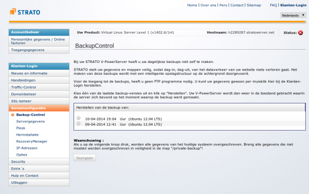 Wanneer de server niet meer goed werkt kan de gebruiker ook gebruik maken van een speciale boot modus waarmee problemen kunnen worden opgelost. Ook maakt Strato elke dag automatisch een backup van de server (tenzij de gebruiker dat niet wil, opt-out).De gebruiker kan met één druk op de knop de backup terugzetten. De backups lijken op willekeurige tijdstippen te worden gemaakt. De laatst gemaakte backup wordt pas een dag later zichtbaar en kan dan pas worden teruggeplaatst. Het lijkt niet mogelijk om een backup te downloaden. Voor het handmatig maken van een backup of snapshot van de server hebben we geen mogelijkheid gevonden.
